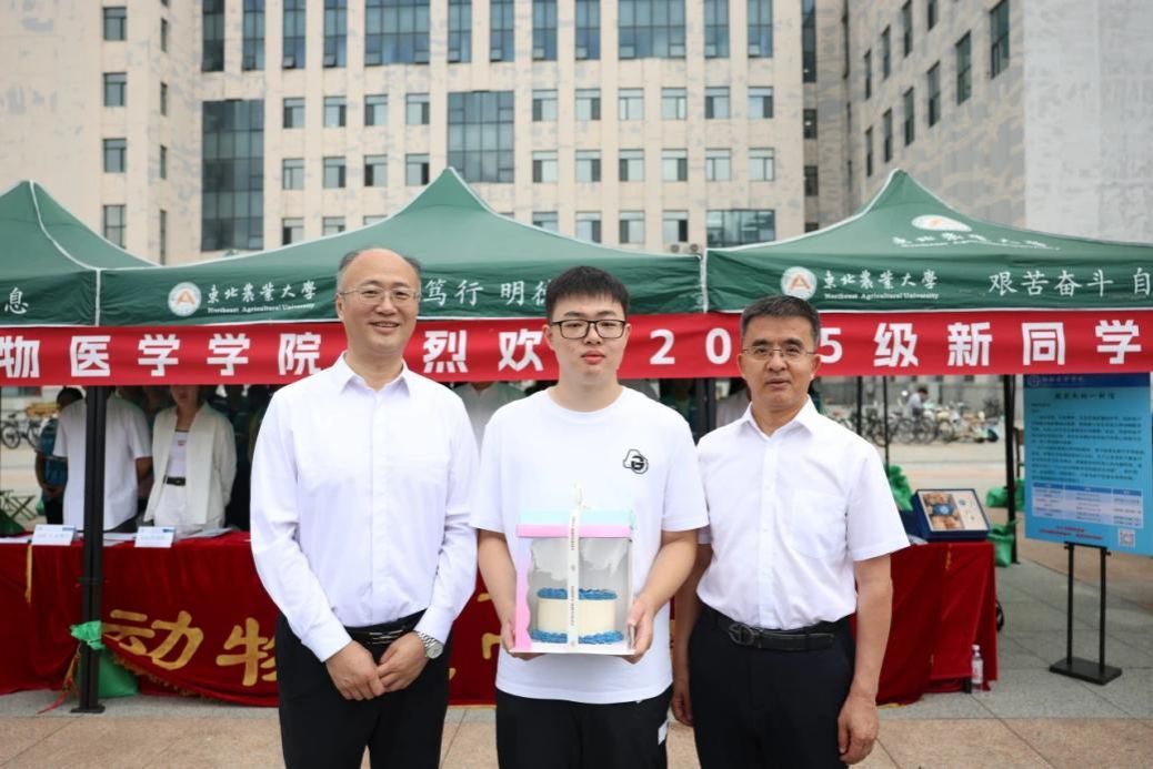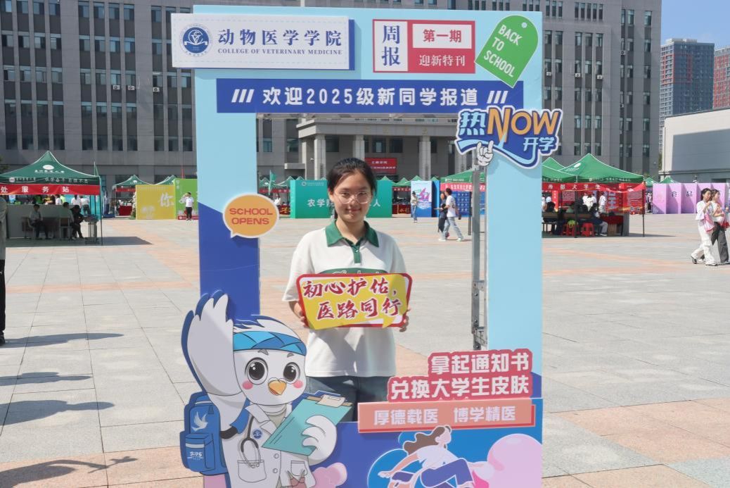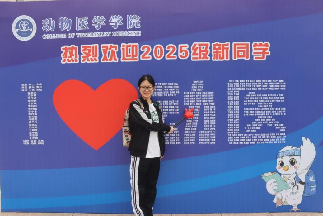 学院坚持以生为本,系统部署迎新流程,提前开展志愿者培训,细化岗位职责,构建起高效协同的迎新工作体系。迎新现场围绕“四个第一”精心设计,为新生打造充满仪式感的入学体验。“我对动医的第一份归属”——学院将全体新生姓名组合成“我爱动医”主题姓名墙,新生在报到时签名留念,帮助新生记录美好瞬间;“我与动医的第一张合影”——学院设置定制拍照打卡桁架,以《动物医学学院周报(迎新特刊)》为设计灵感,融合学院吉祥物“安安”及欢迎标语,配备趣味手持道具,留下大学时代的第一张照片;“我在动医的第一个生日惊喜”——学院为报到期间过生日的4名新生准备生日蛋糕和文创礼物,学校、学院领导亲自送上祝福,温馨的仪式承载着学院的殷切关怀,为新学期添上一抹暖色;“我在动医的第一个梦想”——现场设置“致未来自己的一封信”互动区,新生写下大学心愿与目标,封存后由辅导员统一保管,将于毕业前夕返还,以此铭刻青春梦想。现场还设置学科特色展示区,陈列特色动物、动物模型、动物标本及迎新文创产品,多维度呈现专业魅力与文化底蕴。报到通道标识清晰、流程顺畅,志愿者们热情周到,为新生提供“入校—注册—入住”一站式服务,确保迎新工作高效有序。