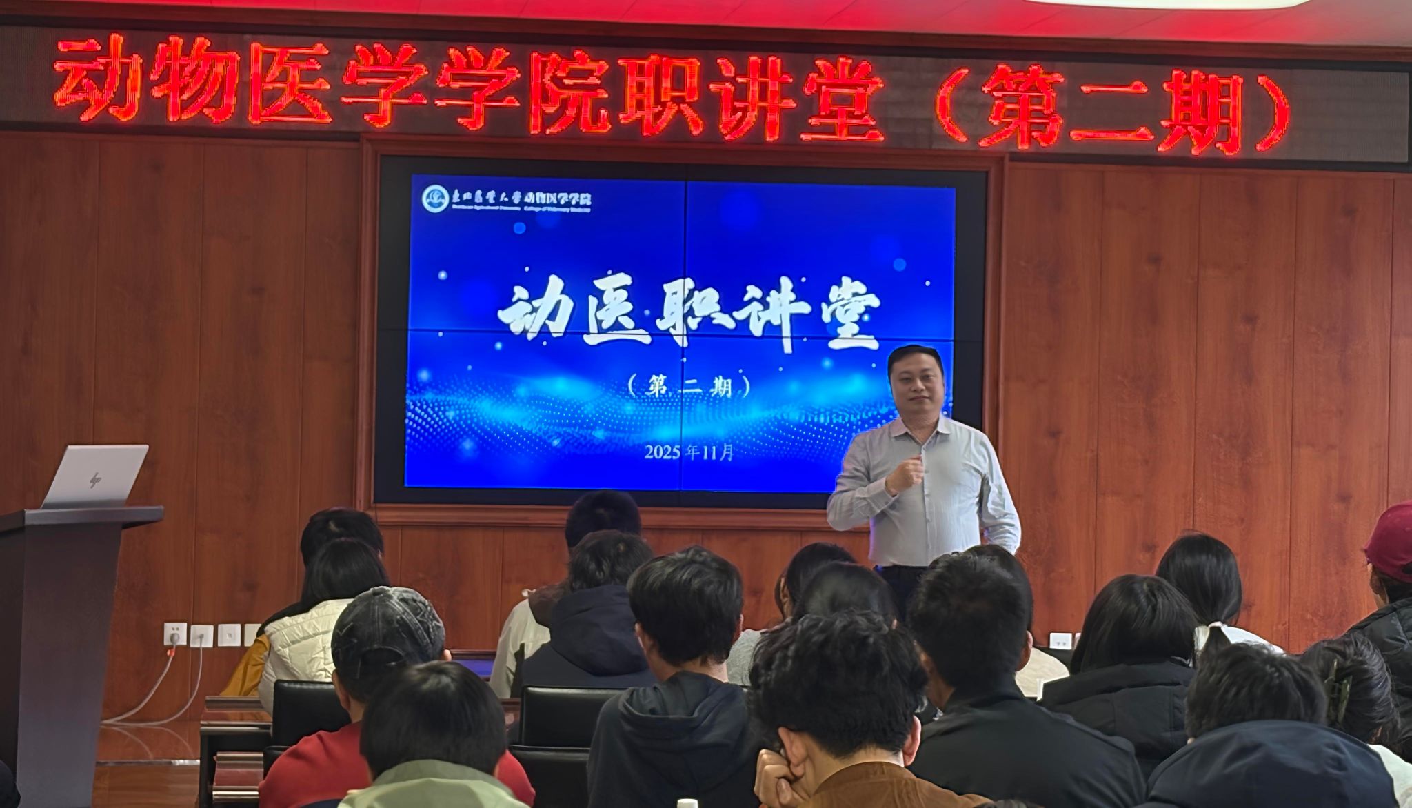 吕军以自身的专业选择、求学历程、职场深耕等成长阶段为例,让与会学生深刻认识到扎实的专业基础和实践课程对职业发展的重要性。从一名普通兽医到行业领军者,他始终秉持东农动医精神,推动标准化诊疗体系建设,致力于提升整个行业的专业水准,为学生们树立了一个“东农动医人”的职业标杆。