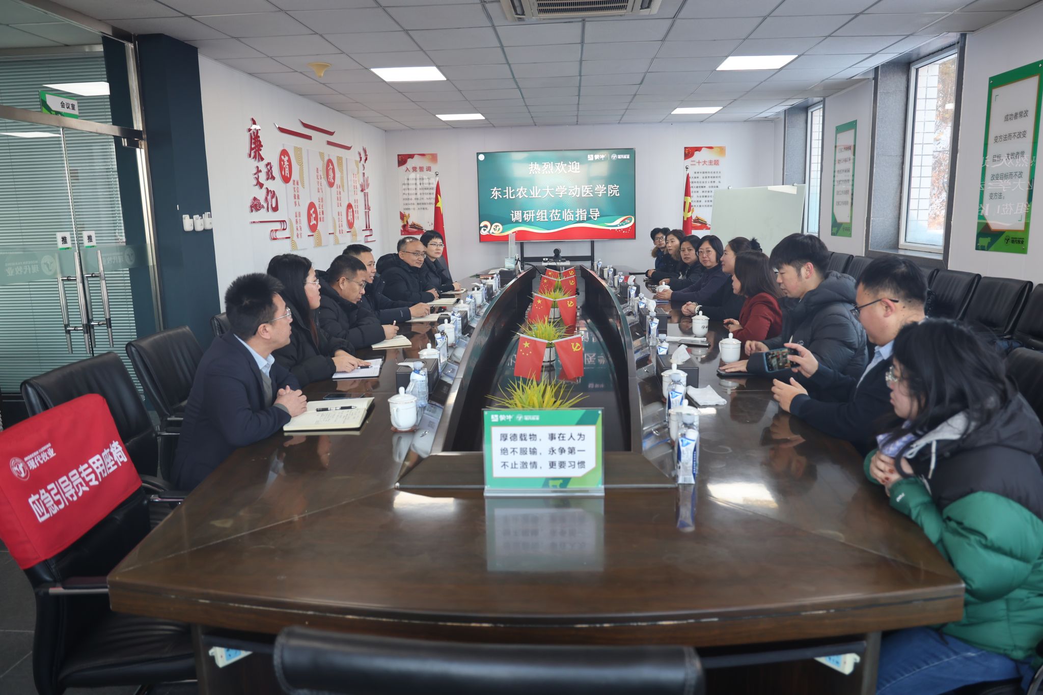 在哈尔滨鹏达种业有限公司,学院一行与尚志市副市长郭海波、鹏达种业副总经理谭首宇、管理副总郑广文、市农业农村局王宪宝、鹏达种业生产负责人景喜全座谈交流。郭海波对学院一行表示欢迎,充分肯定了学院在师资建设与人才培养方面取得的成效,并介绍了尚志市农牧产业发展现状及鹏达种业未来规划。张春燕介绍了学院学科建设、科研方向及毕业生情况,希望与企业共建合作平台,实现资源共享、互利共赢。张鑫琳重点推荐了两名优秀毕业生,表示学院将持续推进就业指导与服务,积极搭建校企对接桥梁。随后,双方围绕企业需求与研究方向进行了深入研讨。冷丽副教授作为鹏达种业的长期指导专家对种鸡在养殖中遇到的问题给予了精准指导;王颢然副教授围绕智慧兽医学方向,详细介绍了基于人工智能等现代信息技术实现对种鸡疾病的诊断、监测与精准预警,为提升鹏达现代化养殖水平提供了智力支持;姚玉杰副教授围绕畜禽重要传染病、营养代谢病发病机制与综合防治等方面问题与企业进行了深入探讨。学生也逐一进行自我介绍,与企业面对面交流,现场气氛融洽,互动深入。